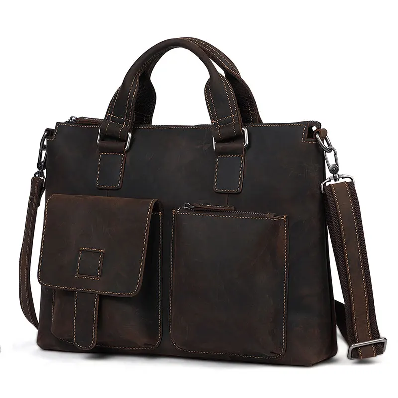 HOT SALE New 2019 Vintage Men's Cow Genuine Leather Briefcase Crazy Horse Leather Messenger Bag Male Laptop